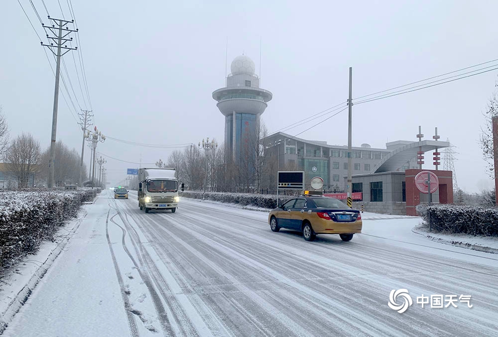 11月18日早晨,海北州西海镇主城区街道路面积雪。(文/赵海梅 图/黎永鹏)