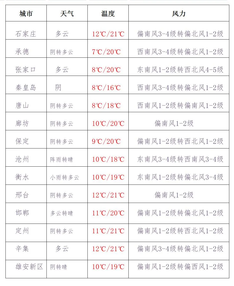 今天白天,张家口东部、承德西部、保定西部、廊坊北部、石家庄北部、沧州东部、衡水东部阴有零星小雨或小雨转多云,其他地区阴转多云。