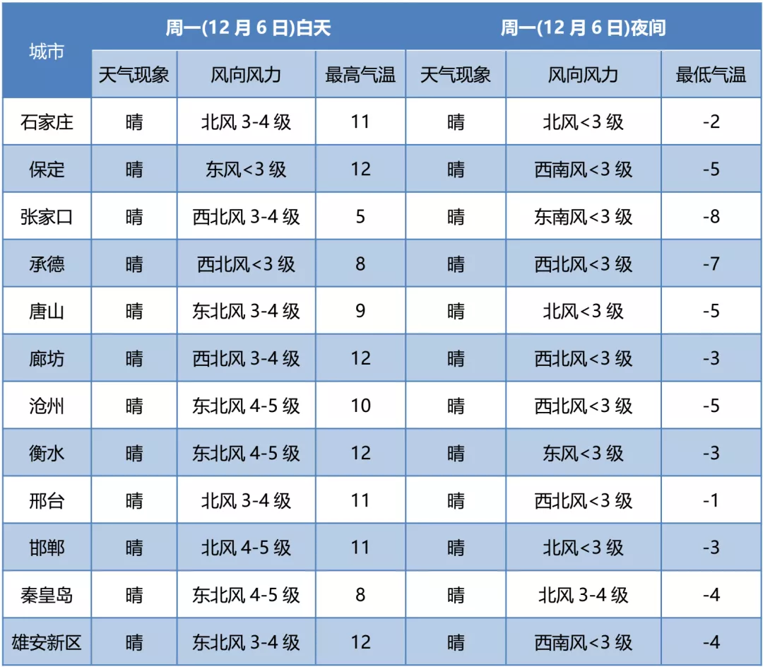 今天夜间,张家口、承德、保定西北部有西北风4到6级,阵风7级;明天白天,全省大部分地区有偏北风4到5级,阵风6级;今天后半夜到明天白天沿岸海域和沿海地区有北到东北风6到7级,阵风8级。