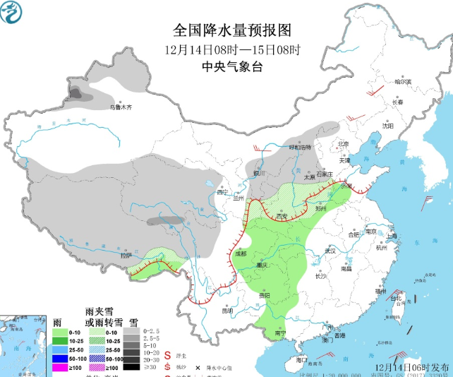 12月14日08时至15日08时,新疆西北部、青藏高原大部、甘肃东南部、陕西大部、山西、黄淮西北部、内蒙古中部偏南地区等地有小雪或雨夹雪,其中,新疆伊犁河谷地区有中到大雪。西南地区东部、湖北西部、湖南西部、广西西部等地的部分地区有小雨。内蒙古东部、辽宁、山东半岛等地的部分地区有4~6级风(见图1)。台湾海峡、南海部分海域将有6~7级、阵风8级的东北风。