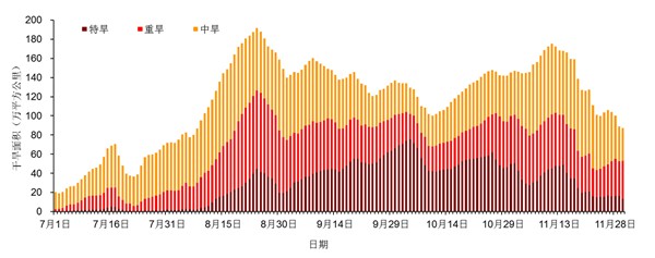 华南、江南气象干旱缓解,西南地区气象干旱持续。进入9月,长江中下游及以南大部地区持续少雨,气象干旱发展加剧。10月1-9日,长江以北地区的降水使气象干旱得到缓解,但长江以南大部地区气象干旱持续发展。11月15-30日,江南、华南出现明显降水过程,其中华南大部、江南大部降水量较常年同期偏多5成以上,局地偏多超过2倍,有效缓解了前期持续的气象干旱。截至11月30日,西南地区东部和南部、湖南西部等地有中旱以上等级气象干旱,其中重庆南部、贵州北部和东南部、湖南西南部、广西北部部分地区有特旱(图5);湘鄂赣粤桂闽黔滇陕川渝浙苏皖14省(区、市)中等及以上气象干旱面积较8月24日减少了104.4万平方公里,其中特旱面积减少了31.2万平方公里(图6)。干旱缓解对江南、华南油菜和冬小麦幼苗生长及露地蔬菜、果树等生长发育十分有利,但贵州等地的部分地区土壤持续缺墒,对当地农业生产有不利影响。