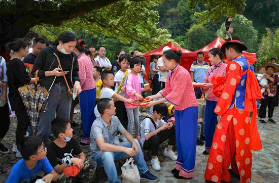福建土楼永定景区里,游客踊跃参与体验民俗演艺活动 温学元 摄