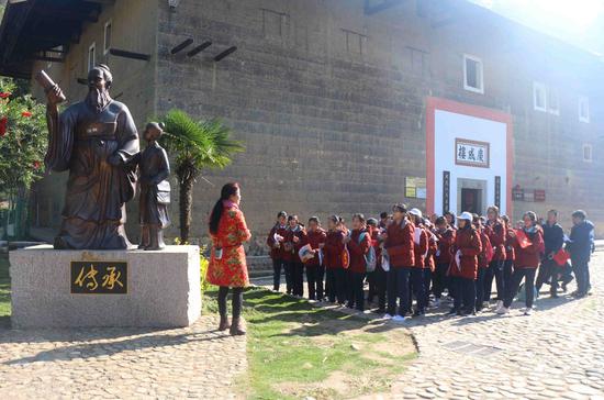 近年来掀起土楼研学热,图为学生们参观客家家训馆,寻找自己的姓氏家训,抄写客家祖训家规。